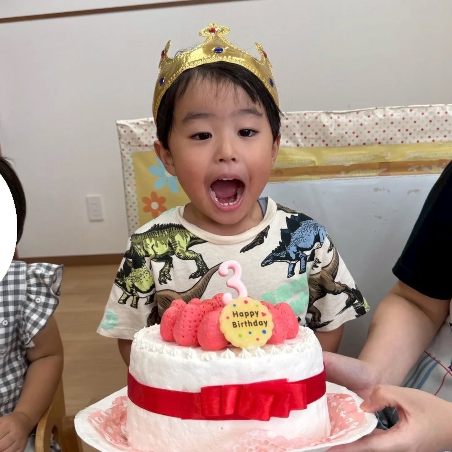 2025.8.19(火) お誕生日会🎂 今日は、7月と8月生まれのお友だちのお誕生日会でした🎉 2人とも0歳児ひよこ🐣組のお友だちでしたので、何が起きているのかわからずに、キョトンとし、少し緊張気味の表情でもありました😅 一歳のお誕生日おめでとう🎊 「ばけばけばけたくん」のマジックシアターをみんなで楽しみました😊
